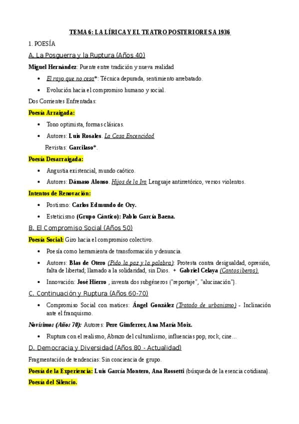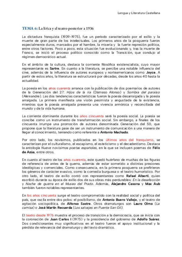 En este documento hay un esquema del tema 6 de literatura de 2ºbachillerato orientada a la Pau. Hay un esquema y una propuesta de respuesta para el exámen. Es el tema de poesía y teatro post1936, con sus autores, obras y características.