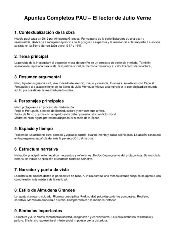 Apuntes sintetizados para realizar el comentario de texto de El lector de Julio Verne de Almudena Grandes. 2º BACH PAU 2026.