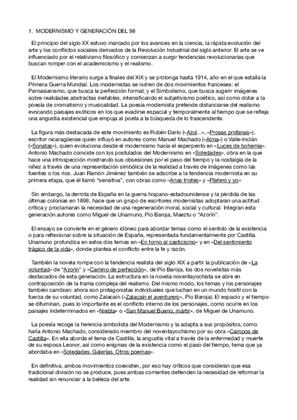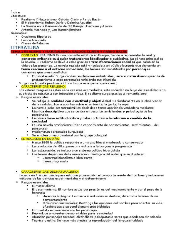 Literatura: • Realismo Y Naturalismo: Galdós, Clarín y Pardo Bazán • El Modernismo: Rubén Darío y Delmira Agustini • La Novela en la Generación del 98:Baroja, Unamuno y Azorín • Antonio Machado y Juan Ramón Jiménez Gramática: • Oraciones Bipolares • Léxic