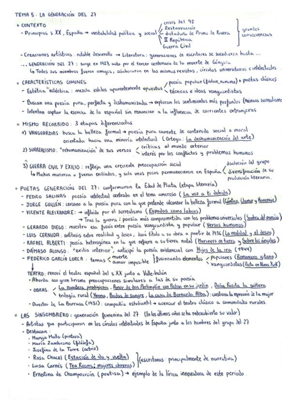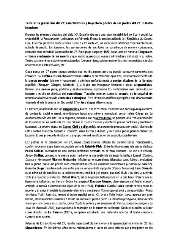 Esquema para facilitar la redacción y el estudio del Tema 5 de literatura y ejemplo de tema redactado a modo de guía. Tema 5: La generación del 27: características y trayectoria poética de los poetas del 27. El teatro lorquiano.