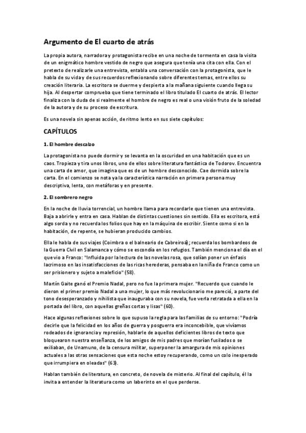 El Cuarto de atras de Carmen Martin Gaite, deglosado por capitulo y explicado.