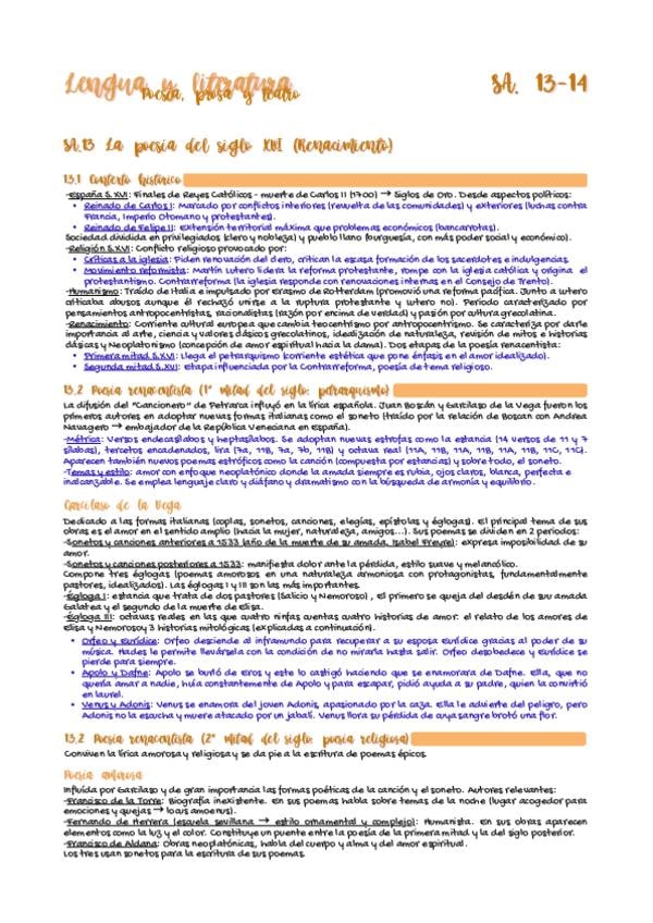 Apuntes de literatura sobre la poesía y prosa del siglo XVI (renacimiento). Resumen de los temas 13 y 14 del libro de Lengua Castellana y Literatura de Santillana (nivel 1º Bachillerato).