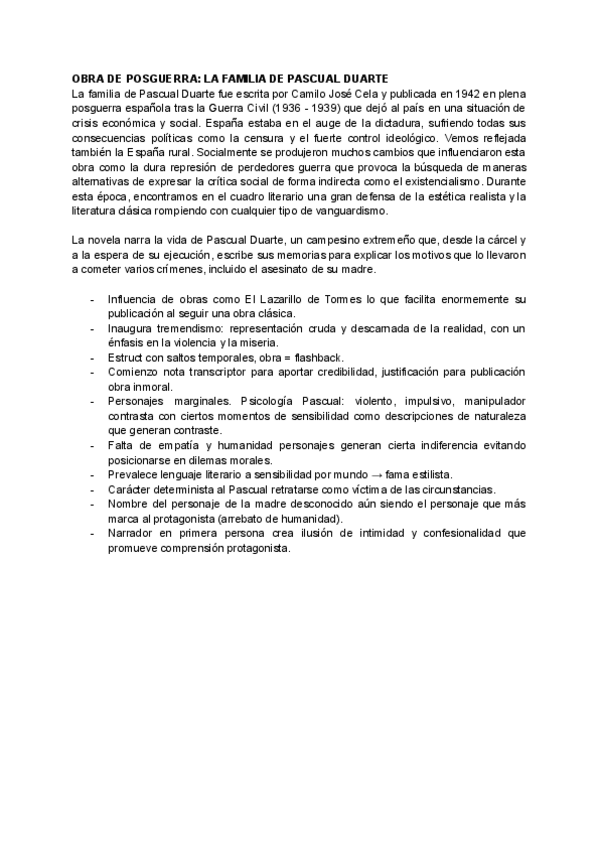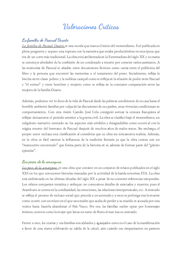Valoraciones críticas para todas los peridos pedidos en la PAU: Siglo XIX: Doña Perfecta Previa a Guerra Civil: Bernarda Alba Posguerra: Pascual Duarte Posterior al 75: Soldados de Salamina Hispanoamericana: Cronicas de una muerte anunciada