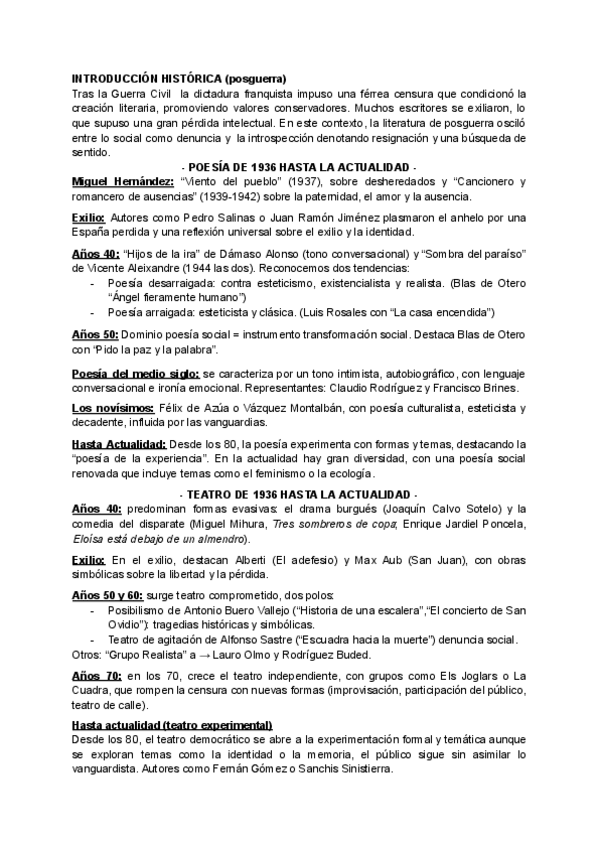 Lírica y teatro posterior al 39, tema de literatura para la PAU. Corregidos por profesor