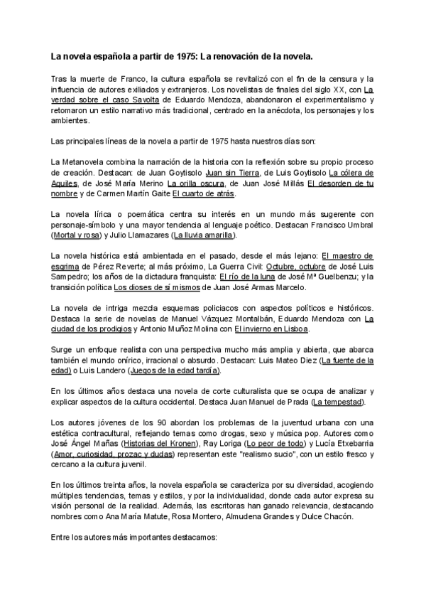 Tema de la narrativa española posterior al 75 para la PAU. Corregido por profesor.
