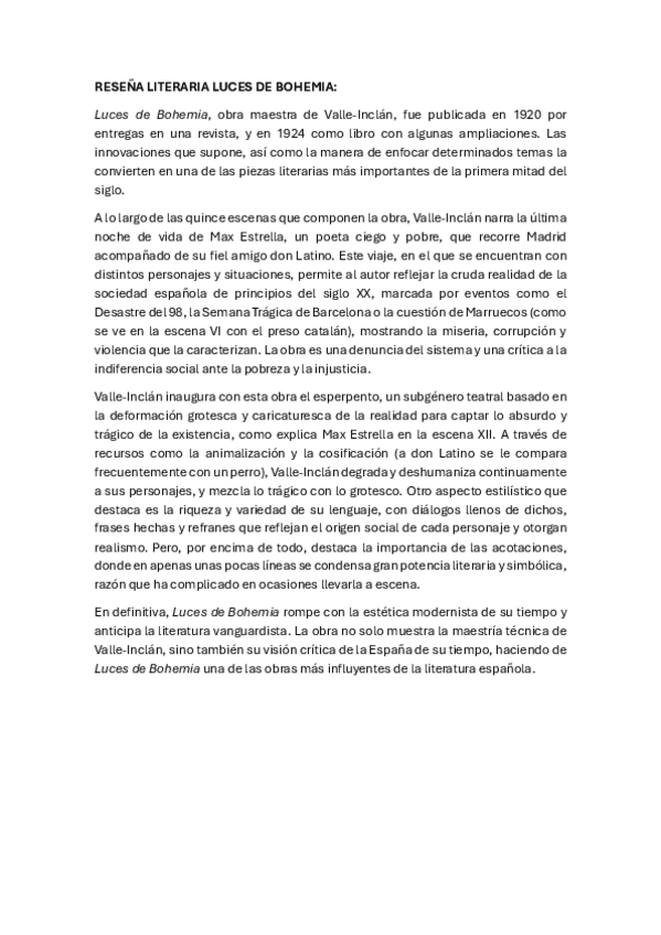 Valoración crítica de Luces de bohemia de Ramón María del Valle-Inclán. Respuesta a la siguiente pregunta de la PAU. "Comente los aspectos más relevantes de la obra española que haya leído escrita entre 1875 y 1936, en relación con su contexto sociohistó