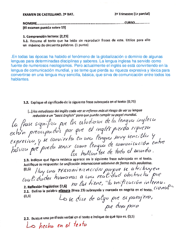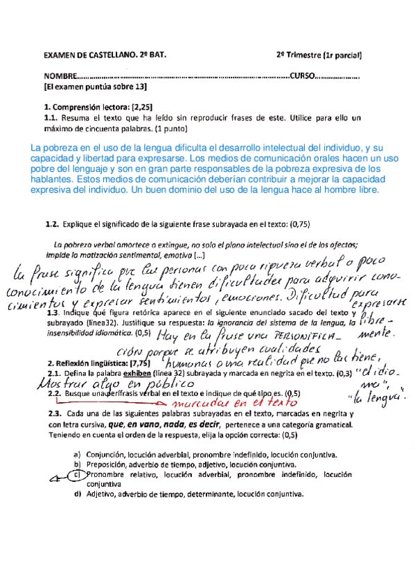 Correcciones de examenes y enunciados de los examenes de lengua castellana de segundo de bachillerato.