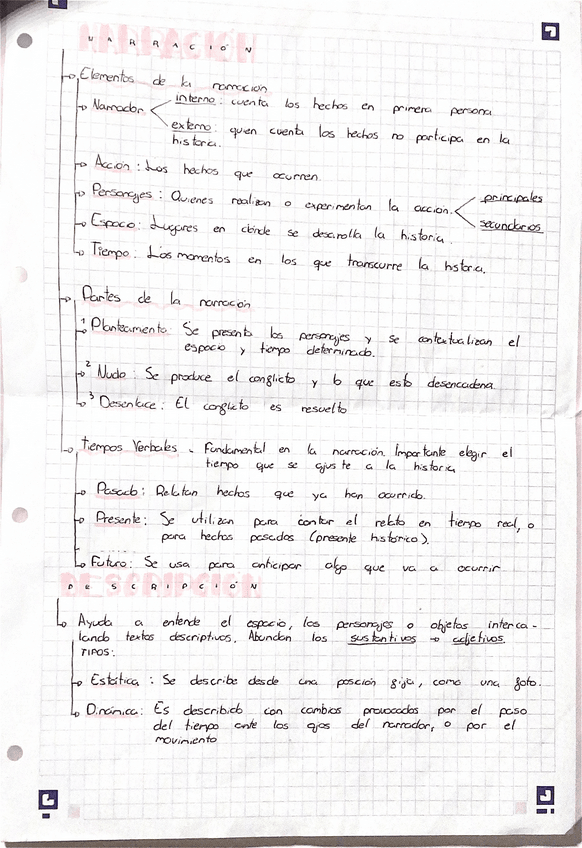 La narración con sus elementos, partes y tiempos verbales y la descripción.Resumidos