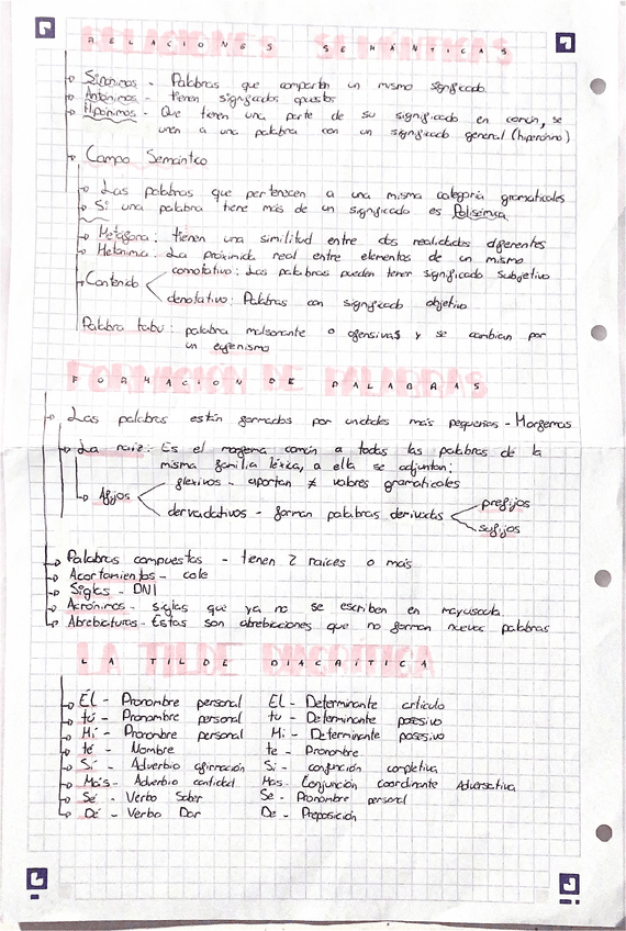 Resumen de la relaciones semánticas, los campos semánticos, la formación de palabras y la tilde diacritica