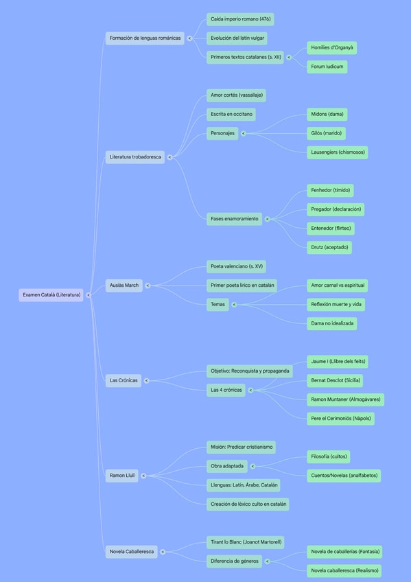 Resum del tema de literatura, conté: La formació de les llengües romàniques, La literatura trobadoresca, Ausiàs March, Les cròniques, Ramon Llull i Tirant lo blanc.
