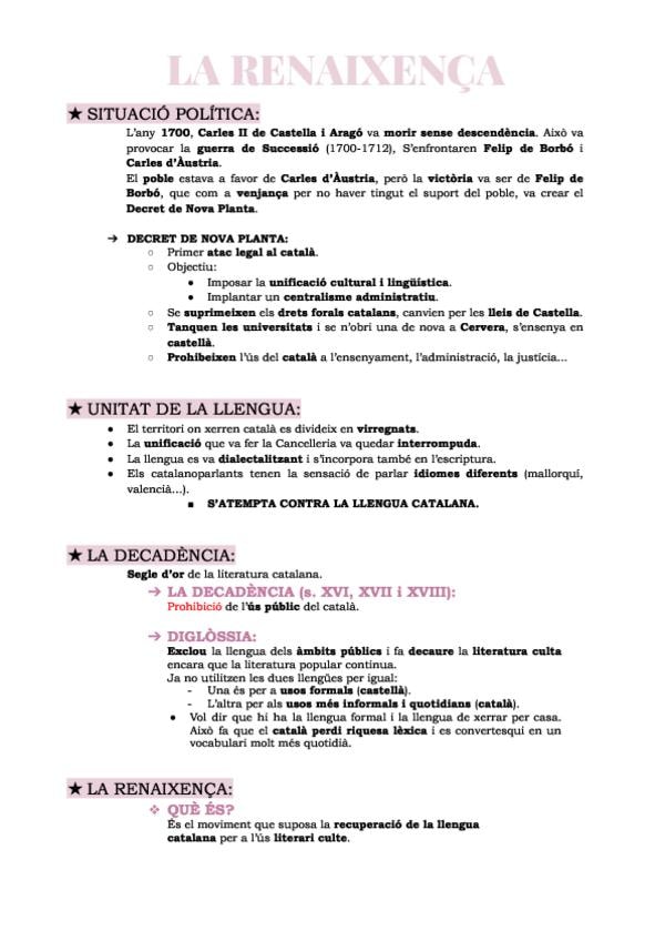 ★ SITUACIÓ POLÍTICA: ➔ DECRET DE NOVA PLANTA: ★ UNITAT DE LA LLENGUA: ★ LA DECADÈNCIA: ➔ LA DECADÈNCIA (s. XVI, XVII i XVIII): ➔ DIGLÒSSIA: ★ LA RENAIXENÇA: ❖ QUÈ ÉS? ❖ ÈPOCA: ❖ POEMA INICIAL: ❖ FACTORS QUE L'AFAVOREIXEN ➔ Causes socioeconòmiques: ➔ Cause