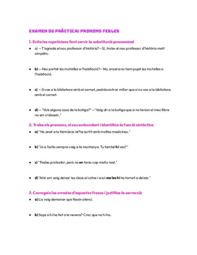 Examen de pràctica, té un apartat amb les solucions. - Evitar les repeticions amb substitució pronominal - Trobar pronoms i antecedents - Corregir errades i justificar la correcció