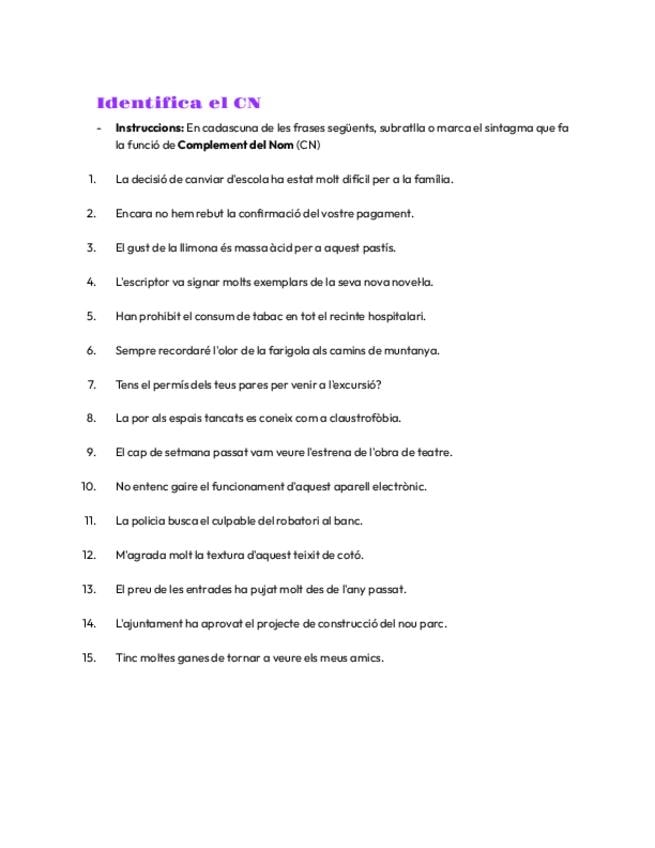 Exercisi per repasar l'identificació del CN, complement del nom. Conté les solucions