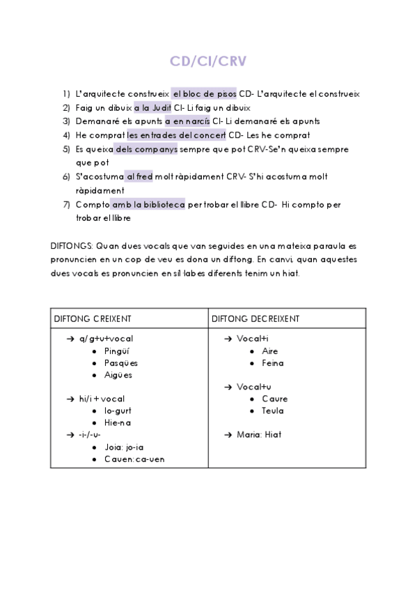 Apunts amb exemples sobre Complement Directe, Complement Indirecte i Complement de Règim Verbal