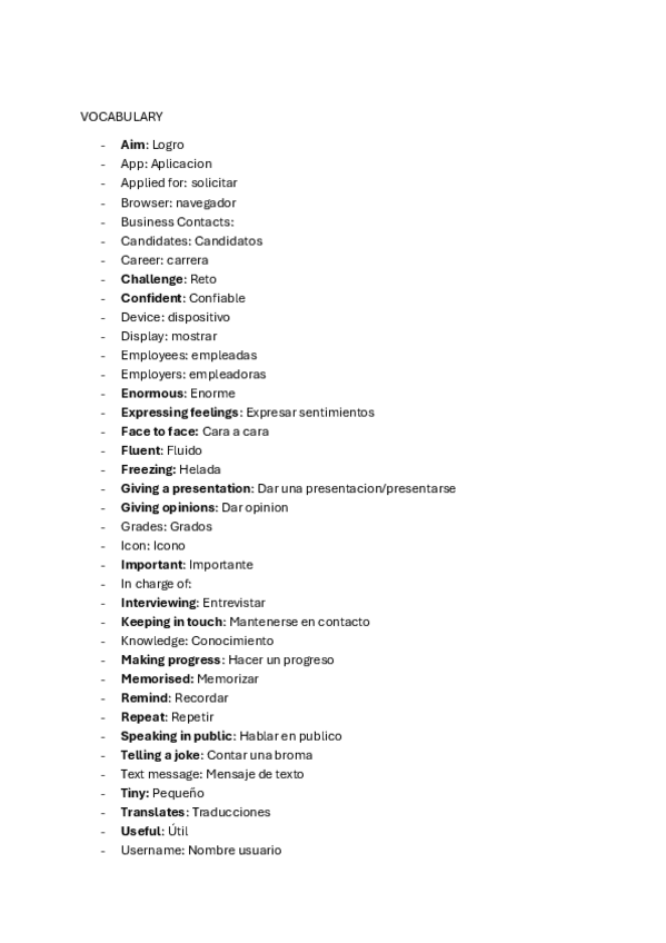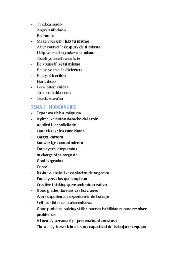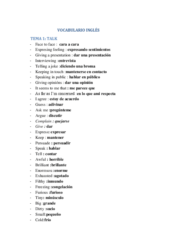 Posible vocabulario de examen tema 1 y 2 ordenados alfabeticamente con sus traducciones