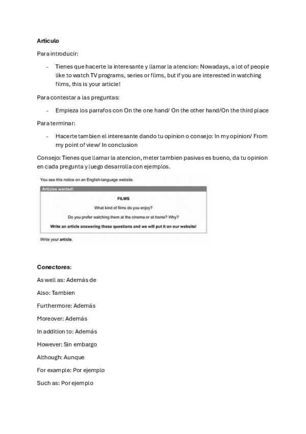 Guía de como hacer un writing nivel b1 alto. Bastante útil con mucha variedad de conectores de todo uso y estructuras.