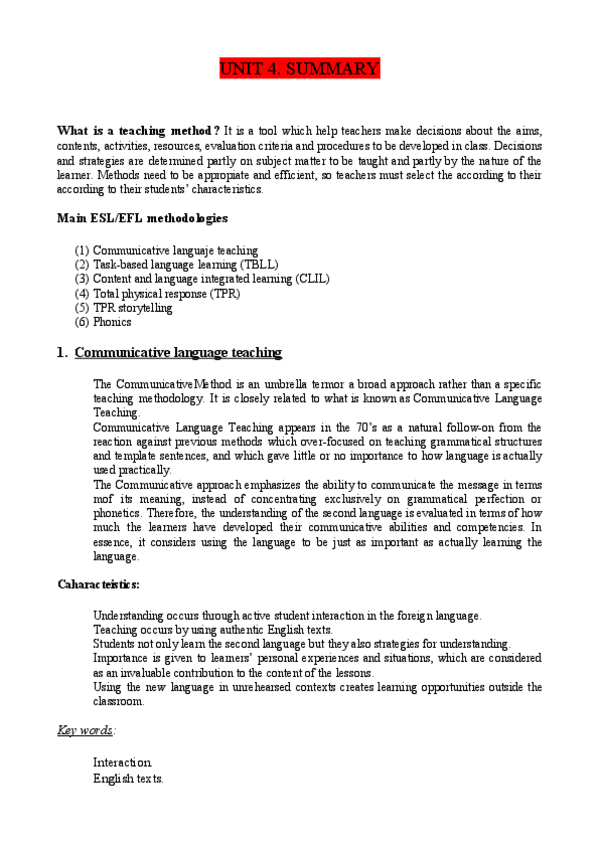 He publicado nuevos apuntes de 1º Lengua Extranjera y su Didáctica. Inglés: UNIT-4-SUMMARY.pdf