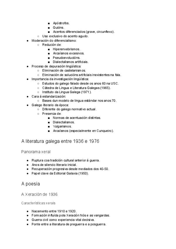 O TEATRO DO PRIMEIRO TERZO DO SÉCULO XX A POESÍA ENTRE 1936 E 1976 DURANTE A DITADURA: a Xeración do 36, a Promoción de Enlace, a Xeración das Festas Minervais. A PROSA ENTRE 1936 E 1976. Os renovadores da prosa: Fole, Blanco Amor, Cunqueiro e Neira Vilas