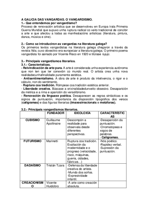Apuntes detallados sobre los movimientos de vanguardia en Galicia. Este documento abarca el contexto histórico, las características de los principales movimientos literarios y artísticos (Creacionismo, Hilozoísmo) y un estudio de las figuras más represent