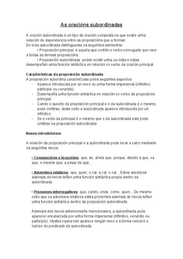 Resumo completo sobre as oracións subordinadas en galego. Explicación clara, con exemplos e esquemas para facilitar a comprensión. Ideal para estudar ou repasar antes dun exame. Inclúe: Definición e estrutura das oracións subordinadas Tipos: substantiv