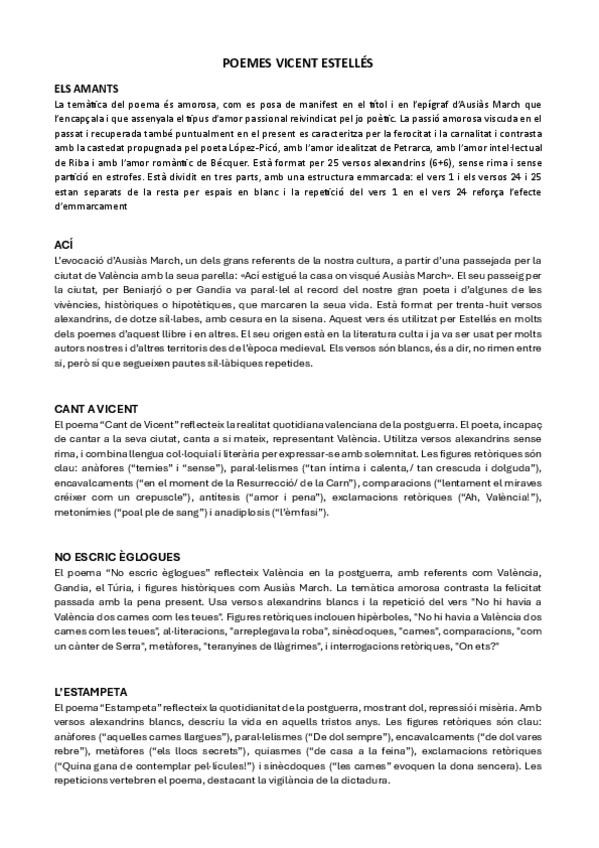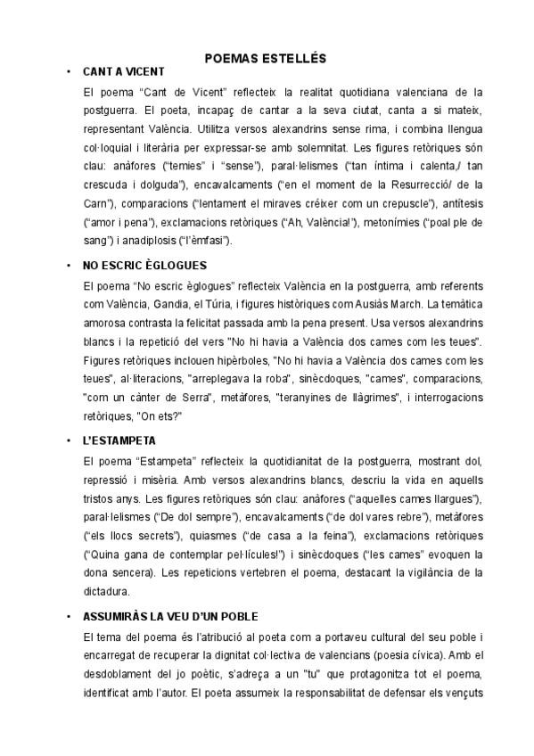Recopilación de poemas de Vicent Andrés Estellés de la PAU 2025 de la comunidad valenciana. La primera hoja es sobre todas las figuras retóricas. Cada una con un color asignado es el que a lo largo de los poemas se le pone cuando aparece.