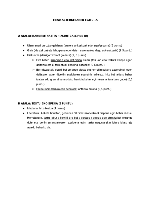 Estructura examen Euskera PAU 2024 Documento con la estructura del examen de Euskera de la PAU 2024. Lo más importante es llevar esto claro para el día del examen y no perder tiempo innecesario.