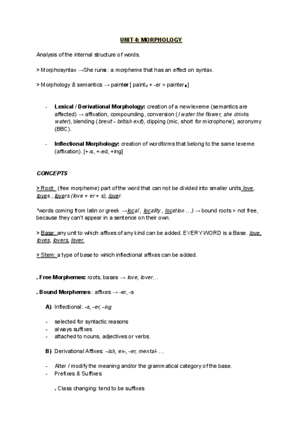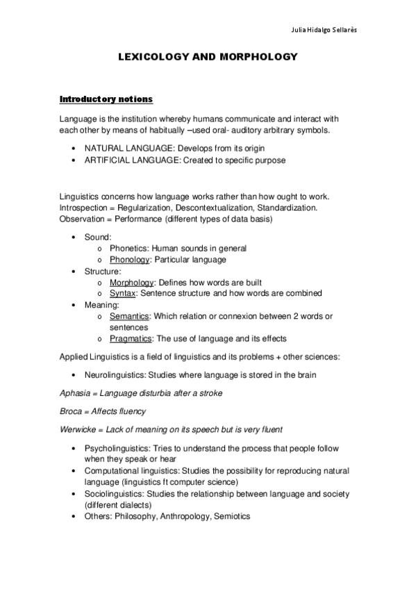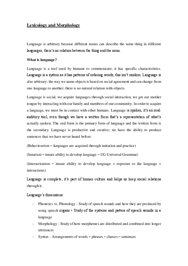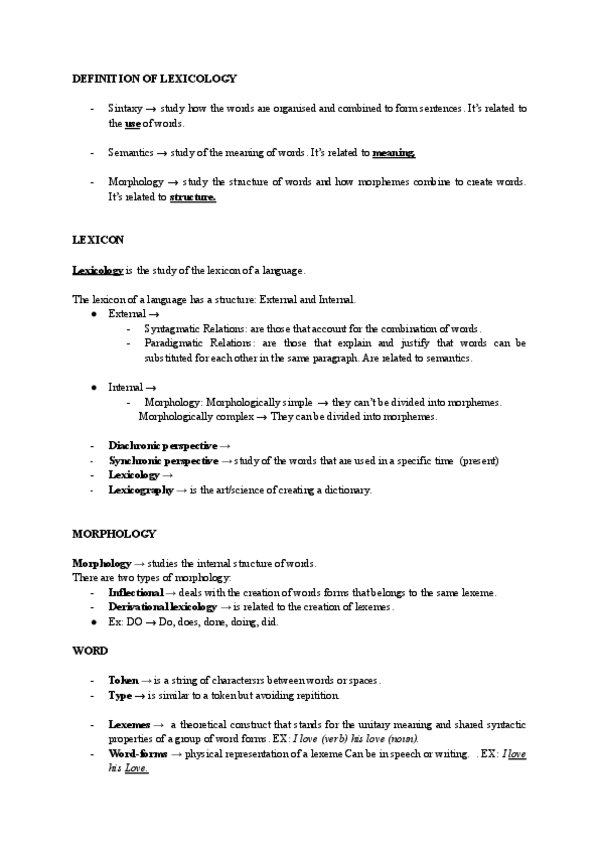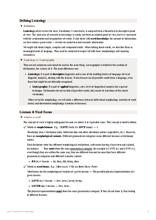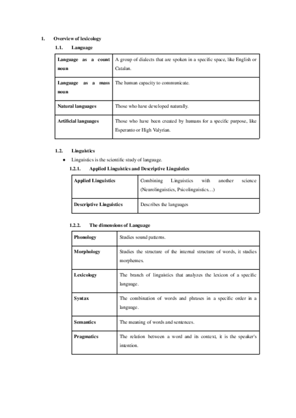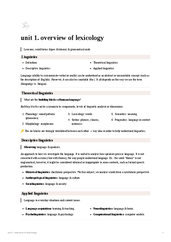 These are some notes about the first unit of Lexicology & Morphology. It includes notes about lexemes, tokens, types, grammatical units, word forms and a general overview of linguistics.