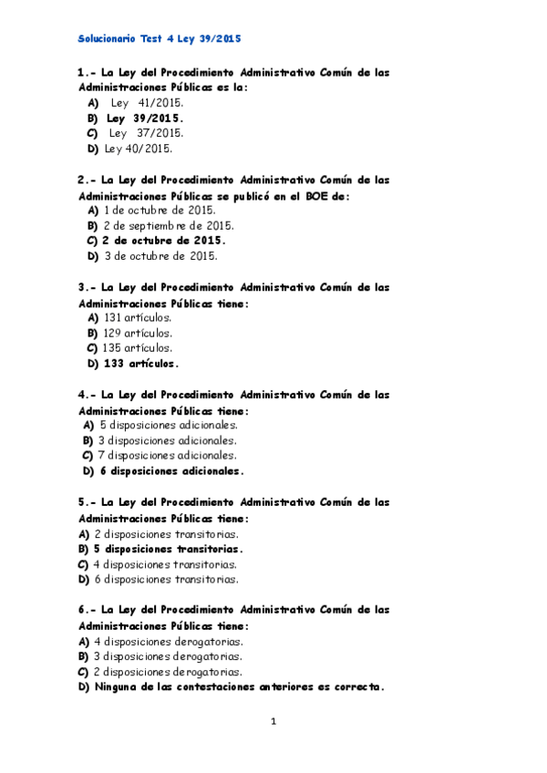 Test con soluciones 39/2015 procedimiento común de las administraciones públicas