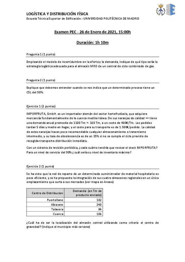 He publicado nuevos examenes de 4º Logística y Distribución Física: examen-PEC.pdf
