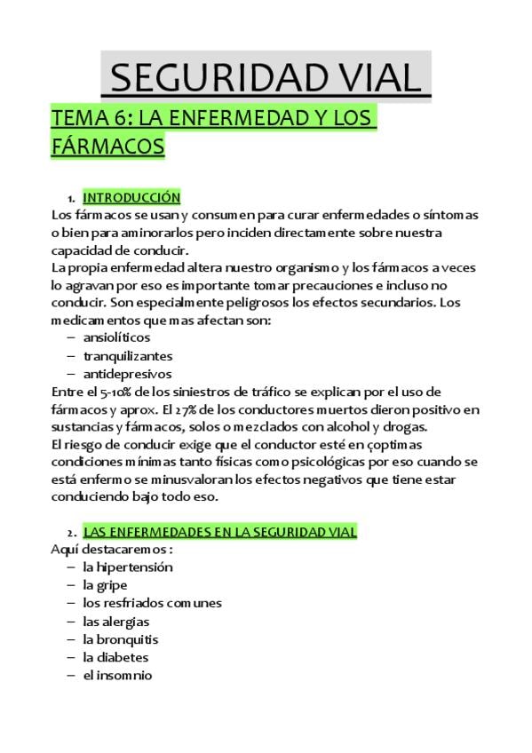 RESUMEN DEL TEMA 6 DEL BLOQUE DE SEGURIDAD VIAL, LA ENFERMEDAD Y LOS FÁRMACOS