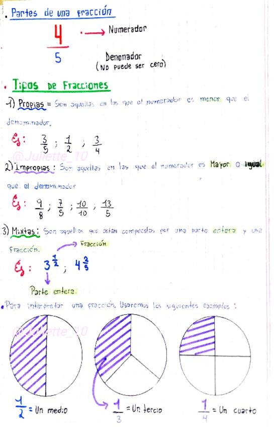 ¡Hola! He preparado este apunte súper claro sobre fracciones. Encontrarás las partes de una fracción, la clasificación detallada (Propias, Impropias y Mixtas) con ejemplos numéricos, y una sección de interpretación gráfica con dibujos para que no te quede