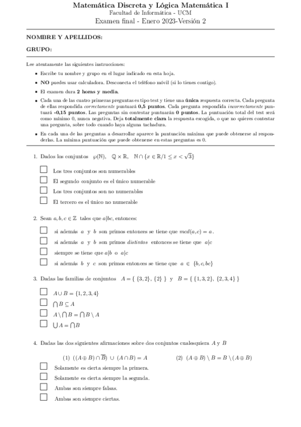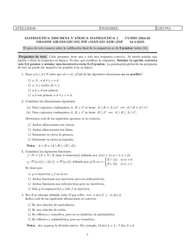 He publicado nuevos examenes de 1º Matemática Discreta y Lógica Matemática I: PARCIAL2-2024-25.pdf