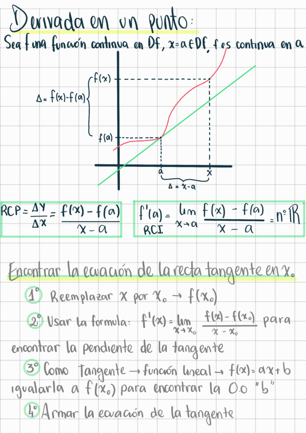 Recta tangente, derivada en un punto, función derivada y sus características, derivada de funciones compuestas (regla de la cadena), reglas de derivación con operaciones, graficar funciones polinómicas, diferencial de una función