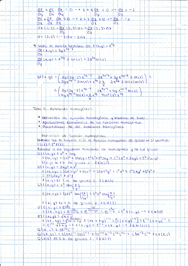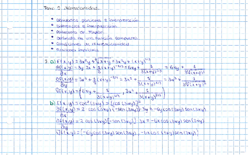 - Derivadas parciales e interpretación - Diferencial e interpretación - Polinomio de Taylor - Derivada de una función compuesta - Condiciones de diferenciabilidad - Funciones implícitas *El ejercicio resuelto a lápiz no está corregido