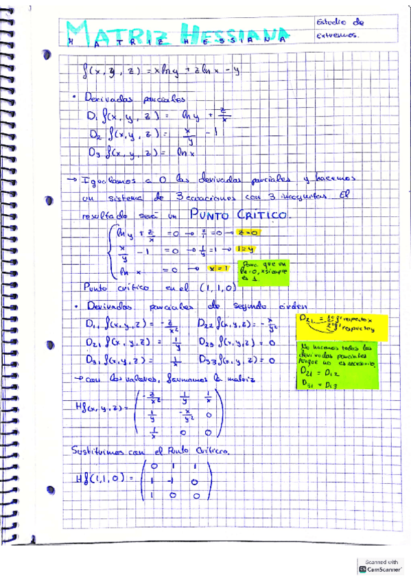 Apuntes sobre integrales, matriz hessiana, ecuación plano tangente y graficas. Todo muy bien expresado para entenderlo.