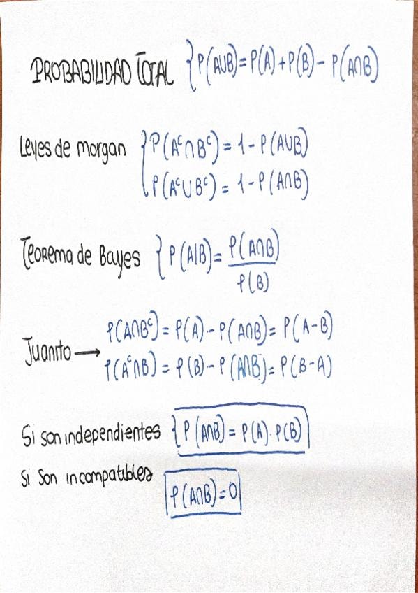 Apuntes claros, visuales y fáciles de estudiar sobre probabilidad y azar para 2º de Bachillerato. Incluyen diagramas de árbol, probabilidad condicionada, Bayes, binomial, normal, fórmulas clave y esquemas para repasar rápido antes del examen.