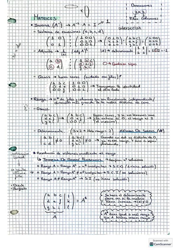 tema de matrices completo con fórmulas explicadas, ejercicios resueltos paso a paso, ejercicios de selectividad de años anteriores (determinantes, matriz inversa, calcular parámetros, sistemas de ecuaciones matriciales, cramer, rouche frobenius, probelmas