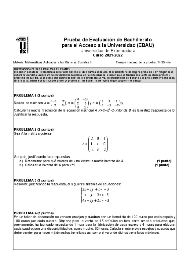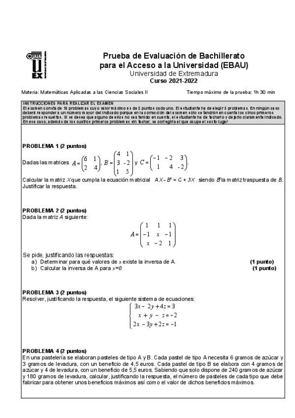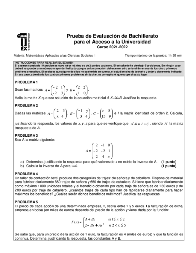 Exámenes Matemáticas Aplicadas a las Ciencias Sociales EBAU 2022