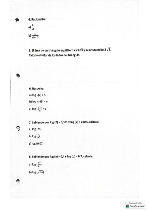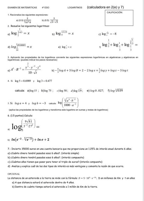 Ejercicios de repaso para antes del examen, números reales, logaritmos, y raíces