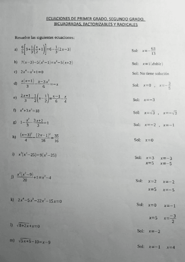 Ejercicios ecuaciones primero, segundo grado, radicales, racionales e inecuaciones CON SOLUCIONES