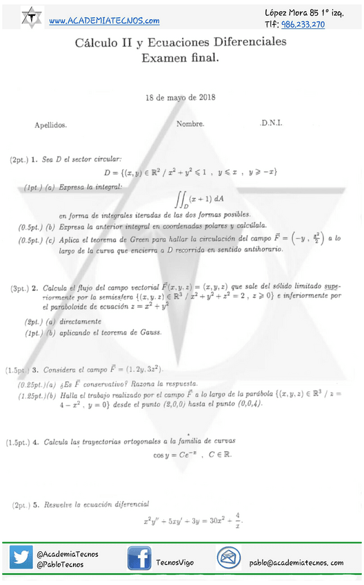 He publicado nuevos examenes de 1º Matemáticas: Cálculo Ii e Ecuacións Diferenciais: Final-2021-mayo.pdf