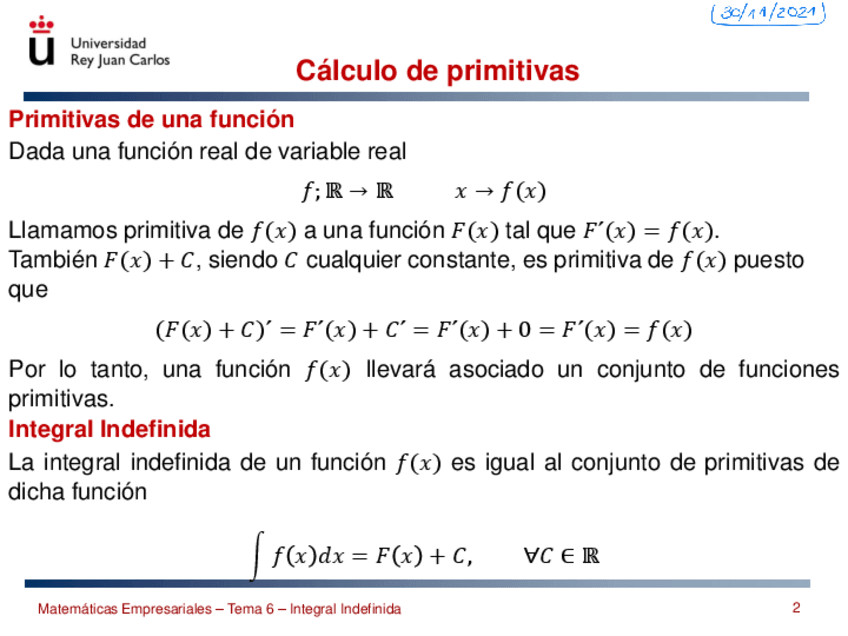 Tema 6. Integrales Indefinidas. Fragmento del SPEEDRUN de MATEMÁTICAS EMPRESARIALES