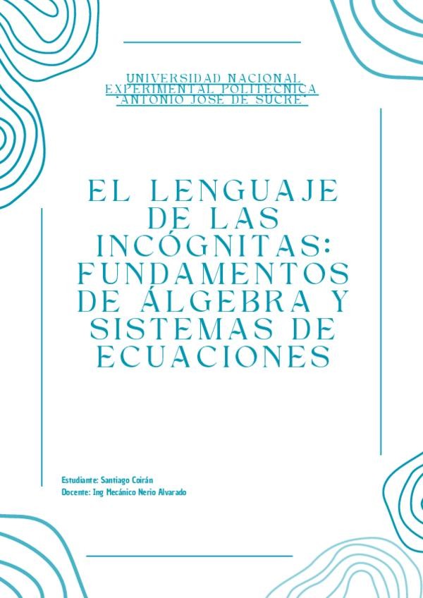 Este documento, titulado "El Lenguaje de las Incógnitas", es una guía educativa sobre los fundamentos del álgebra y la resolución de sistemas de ecuaciones. Fue elaborado por el estudiante Santiago Coirán para la Universidad Nacional Experimental Politécn