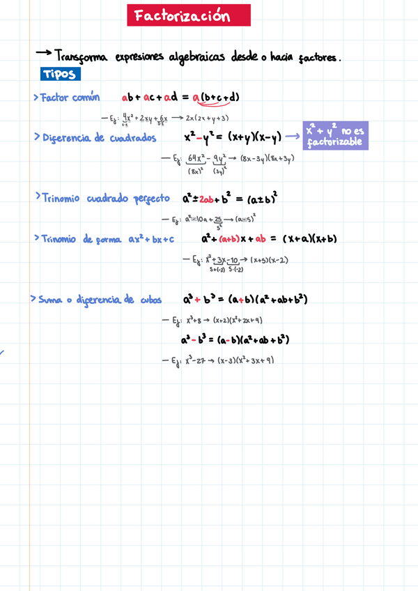 La factorización, en matemáticas, es el proceso de descomponer una expresión en un producto de factores más simples. En este documento se muestran los diferentes tipos, su forma y ejemplos.