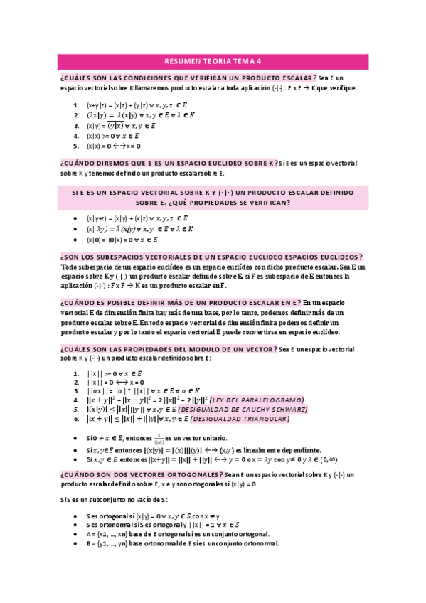 Esquema-resumen de la teoría del T4. Espacios Euclídeos + teoría Prob. Lineal de los Mínimos Cuadrados (teoría y paso-a-paso)