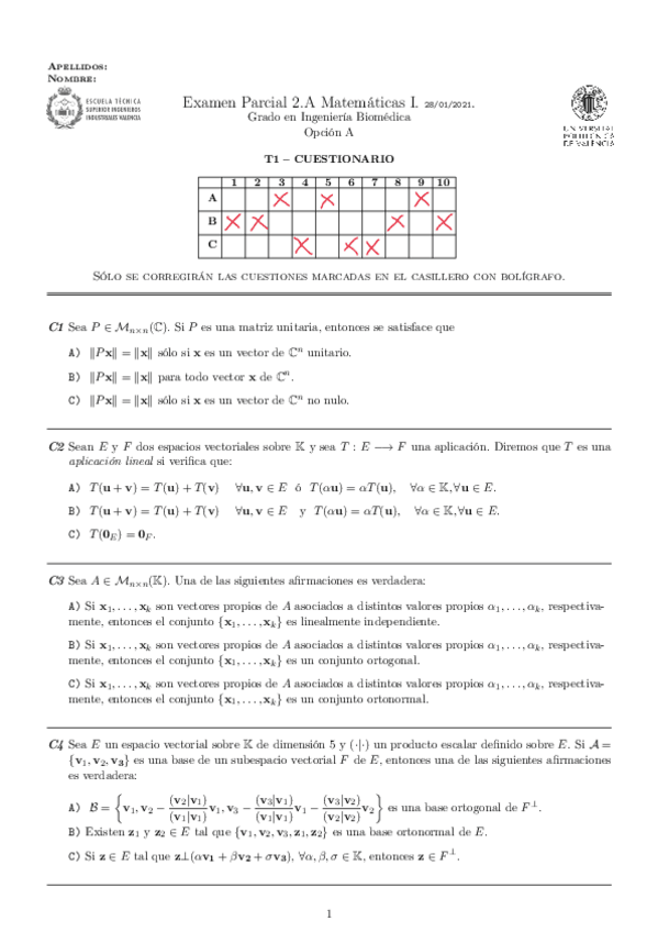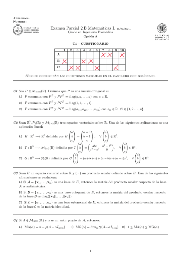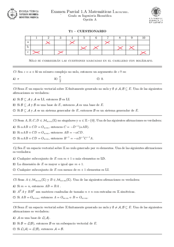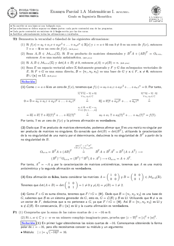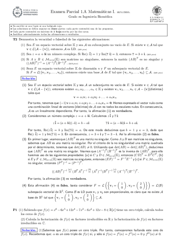 He publicado nuevos examenes de 1º Matemáticas I: Solución 1Parcial 2021