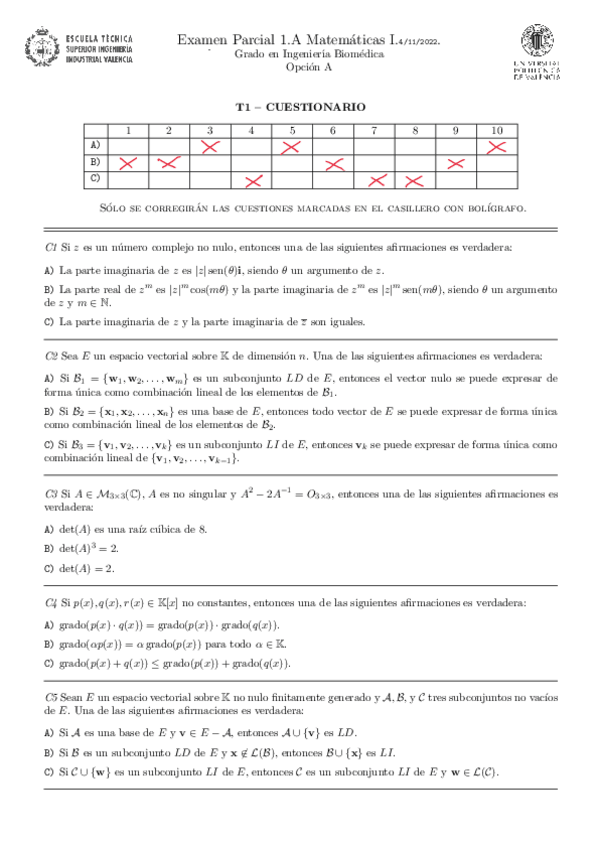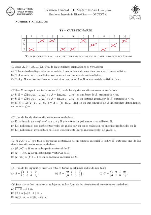 He publicado nuevos examenes de 1º Matemáticas I: Solución 1Parcial 2022