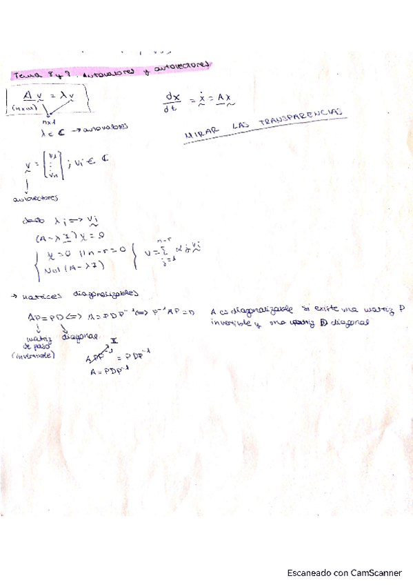 Apuntes del tema de autovectores y autovalores. Tambié incluye multiplicidad y matrices diagonalizables