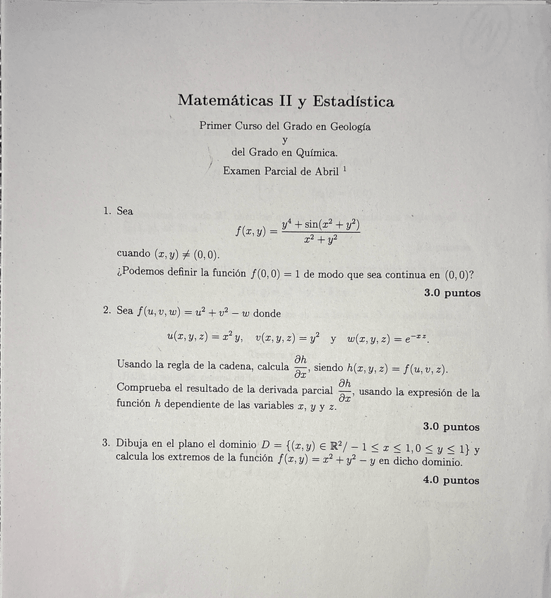 Examen parcial 2025 de la primera parte de matemáticas II y estadística