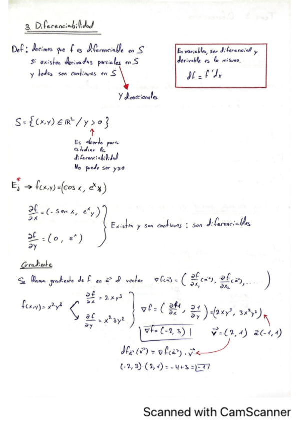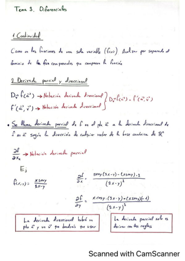 Continuidad // Derivada parcial y direccional // Diferenciabilidad (con ejemplos de sus integrantes) // Resumen